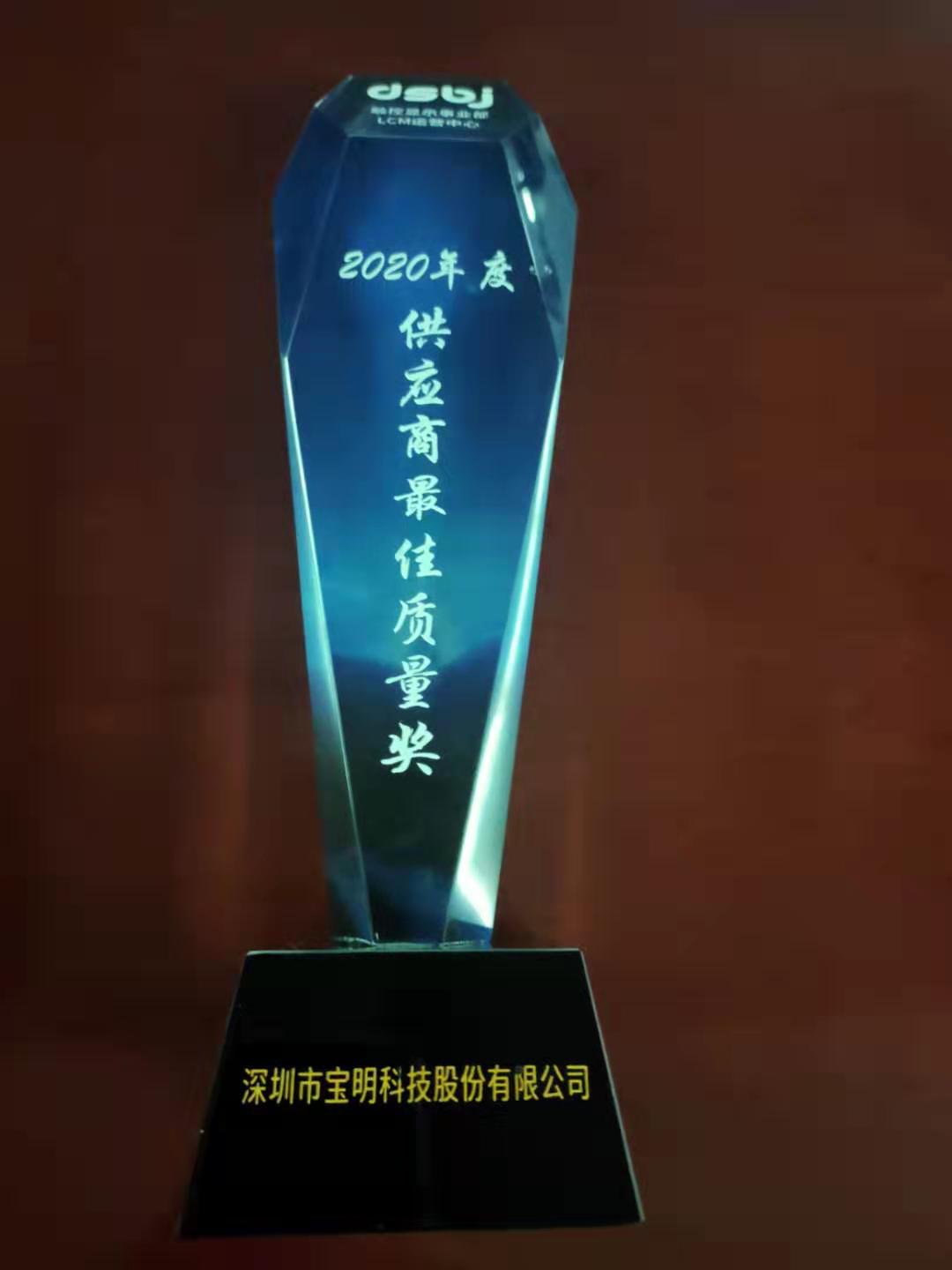 2020年我司以“品質(zhì)、交期、服務(wù)”各方面綜合優(yōu)異表現(xiàn)榮獲東山精密2020年度“供應(yīng)商最佳質(zhì)量獎(jiǎng)”,并獲頒獎(jiǎng)杯。